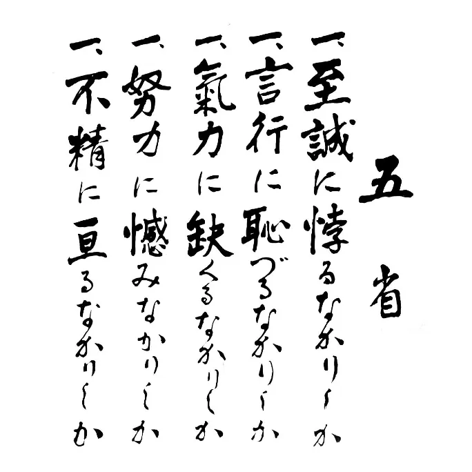 日々の自分の行動を反省する目的の五つの項目です。学生時代の寮生活で夜の自習時間に全員で復唱していました。
